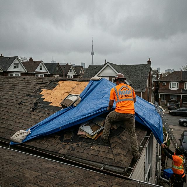 Contact a licensed, insured roofing contractor who offers 24/7 emergency service. In Toronto, The Roof Technician provides same-day emergency tarping and temporary repairs to stop active leaks while a permanent solution is planned.